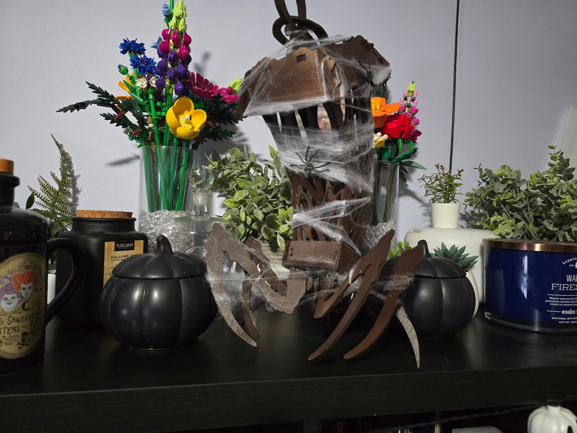 Decorating a bookshelf, mantle, or table for that cozy–creepy vibe 🕸️
